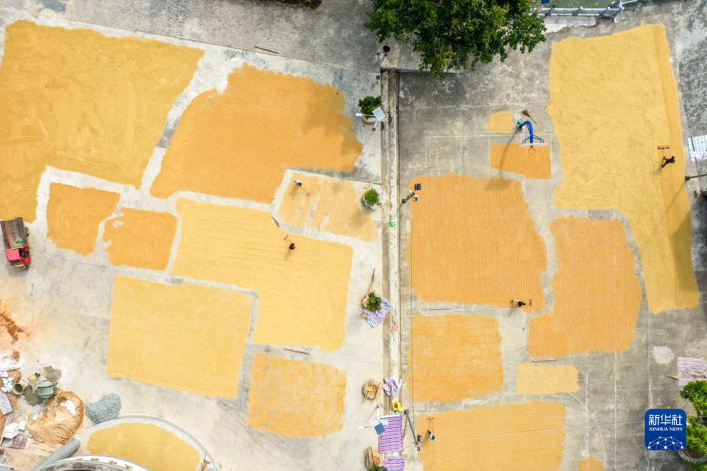 11月9日,在兴业县葵阳镇葵联村,村民将收获的稻谷摊开晾晒(无人机照片)。