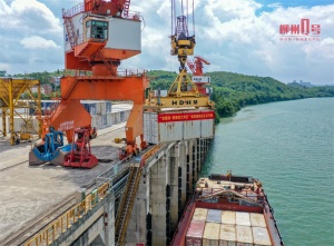 9月12日,柳州港官塘作业区内一派繁忙景象,吊装设备正有条不紊地将集装箱吊运至“贵港华海2020”货船上。该码头首条“官塘港——粤港澳大湾区集装箱航线”启用,将进一步助力柳州市港口吞吐量提升。图为在柳州港官塘作业区码头,发往粤港澳大湾区的集装箱被吊运上货船。记者 宁静波 覃科 摄(柳州1号)
