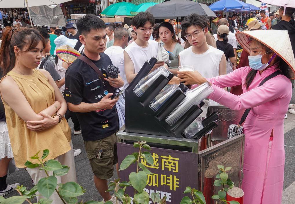 2025年5月4日,游客在广西防城港东兴市国门景区购买越南咖啡。新华社发(刘峥 摄) 作为我国与东盟唯一海陆相连的边境口岸城市,东兴与越南芒街仅一河之隔。而东兴口岸是我国唯一与越南海陆相连的国家一类口岸。据统计,截至11月21日,东兴口岸及边民互市贸易区2025年出入境人员数量已超820万人次。
