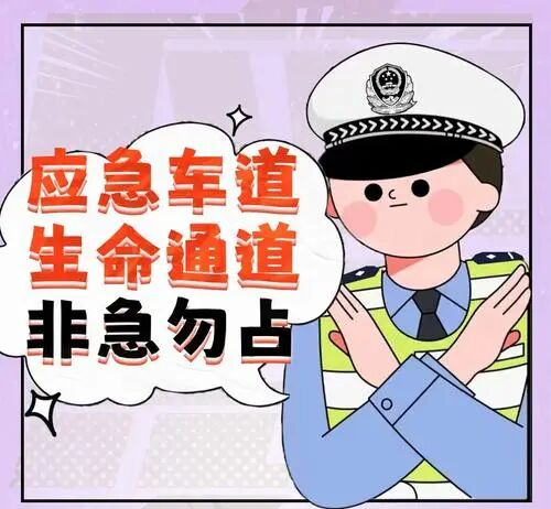 交警提醒 驾车出行遇到车辆缓行路段 请耐心等待依次排队通行 安全文明行车 切莫占用应急车道 |
