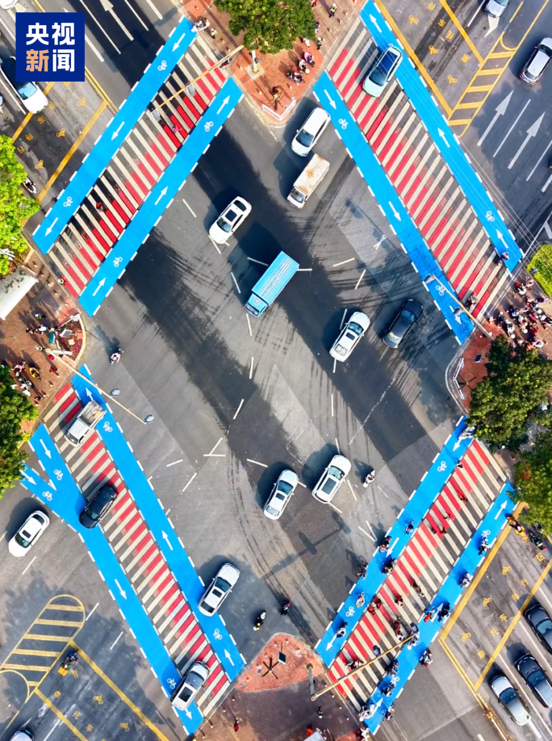 近日,广东清远一交通路口 推行“蓝道过街”新模式 行人走中间人行横道 非机动车走两侧蓝色专属通道 实现人车分流、各行其道 网友纷纷点赞:建议全国推广! 核心地段存通行痛点 “蓝道过街”新模式位于广东清远清城区凤城世家路口,这里是中心城区核心地段,周边有多个大型居民小区,商场、写字楼、中小学等公共服务场所密集。 由于早期道路设计以机动车通行为主,非机动车道在路口中断,导致电动自行车大量驶入机动车道等候,或在人行横道与行人混行。机动车通行效率下降,高峰期机动车往往要等候2至3个信号灯周期才可通过。 长期在路口执勤的交警表示,“以前这个路口,机非混行、人车抢道的情况特别突出,高峰期安全岛上挤得满满当当,人都站到马路边上了。” 因此,这个路口成为两条主干道的通行“瓶颈”,严重制约了整体运行效率。 三大“微调整” 通行与安全双提升 面对这一痛点,当地部门决定以“微改造”实现“大提升”,核心理念是“最小干预、最大畅通”——不搞大拆大建,仅通过优化道路组织、完善设施配套,实现通行效率和安全水平的双重提升。 主要做了三个“微调整”—— 增设“蓝道过街”专用通道,实现路权归位。在斑马线两侧专门施划浅蓝色非机动车骑行专用通道,用标线将行人与非机动车分开,实行“人走中间、车走两侧”的通行模式。